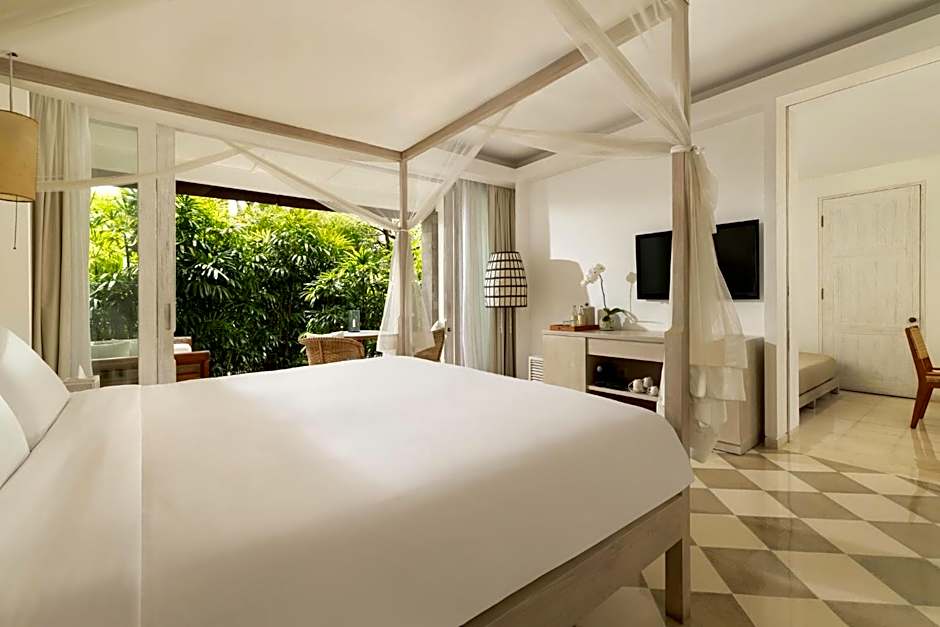 Bright and airy, this room has large French doors opening onto a private terrace overlooking the garden. The bedroom features a four-poster bed and a private bathroom with a bathtub and an outdoor shower.